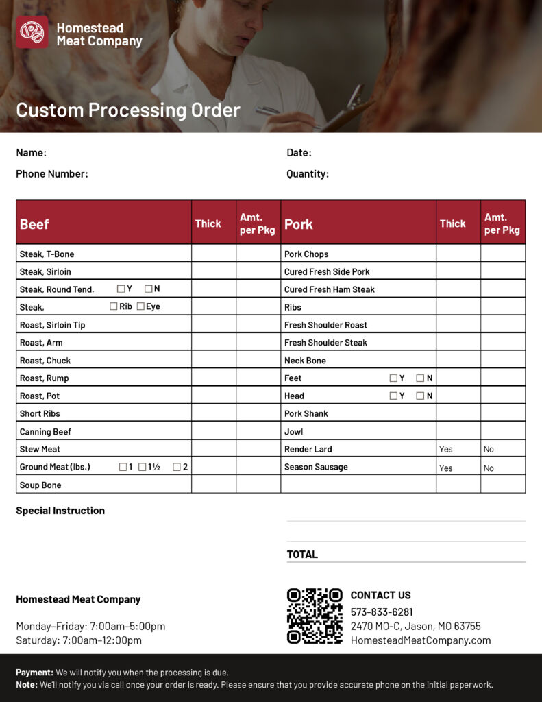 Drop off livestock → Fill instruction sheet → We process → Pickup. See our Custom Processing form